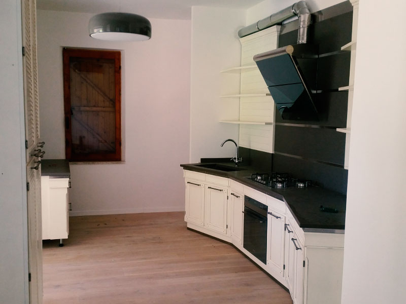 Ristrutturazione villa privata nel comune di Polverigi, alle porte di Ancona. Ampia struttura su due piani, di circa 116 e 70 mq l’uno, realizzata seguendo criteri di semplicità, e luminosità: le pareti bianche e il pavimento in parquet chiaro ben si sposano con la geometria delle superfici, donando calore e intimità, e facendo risaltare le finiture e la mobilia moderna.